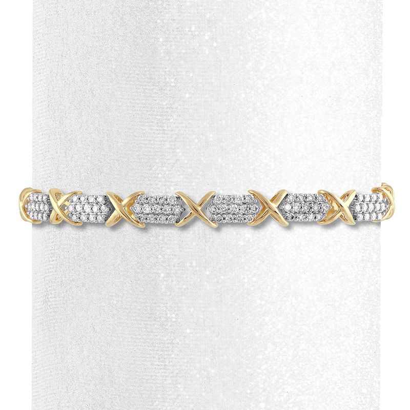 This incredible bracelet for her features brilliant clusters of round diamonds separated by 10K yellow gold “kisses.” The 7.5-inch bracelet has a total diamond weight of 3 carats and fastens with a tongue clasp.