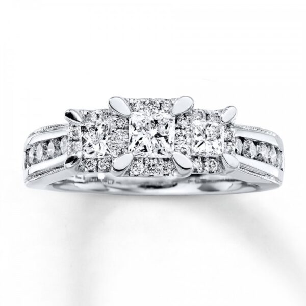 Representing your past, present and future together, this three-stone ring dazzles with a trio of princess-cut diamonds framed in round diamonds as its centerpiece. More round diamonds are channel-set along the band of 14K white gold to complement. The ring has a total diamond weight of 1 carat.